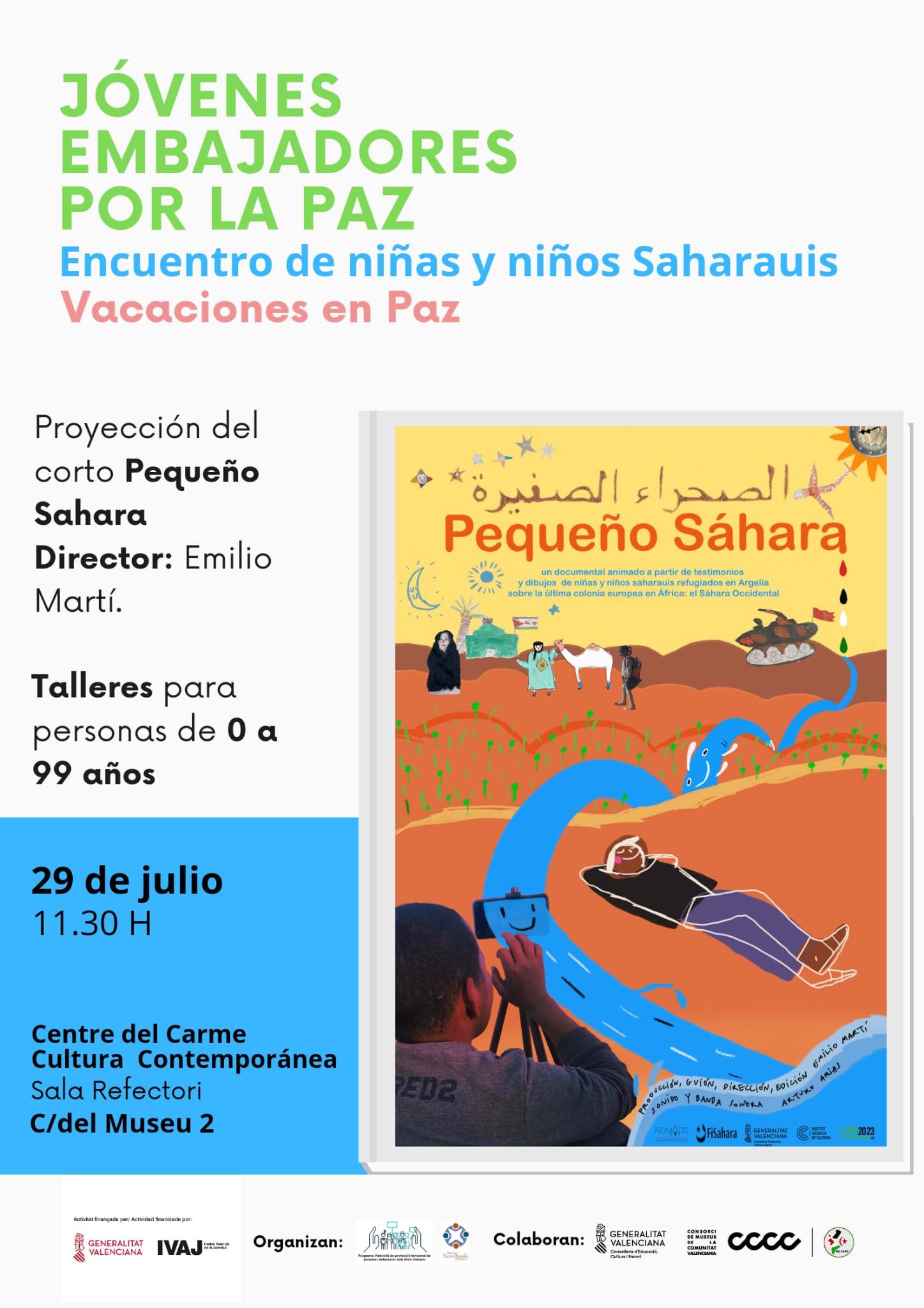 El próximo sábado 29 de julio, a las 11:30 de la mañana, daremos la bienvenida a los niños y niñas saharauis que pasan sus Vacaciones en Paz (lejos del refugio obligado en el que viven, desde que Marruecos invadió su país), con un pase de PEQUEÑO SÁHARA en el Centre del Carme Cultura Contemporània de València. Además Teresa Gomis y Miquel Puig presentarán el libro “Suadu en el corazón”, un relato de la tradición oral saharaui, y habrá un taller de postales solidarias para el Sáhara Occidental. ¡Nos vemos el sábado!