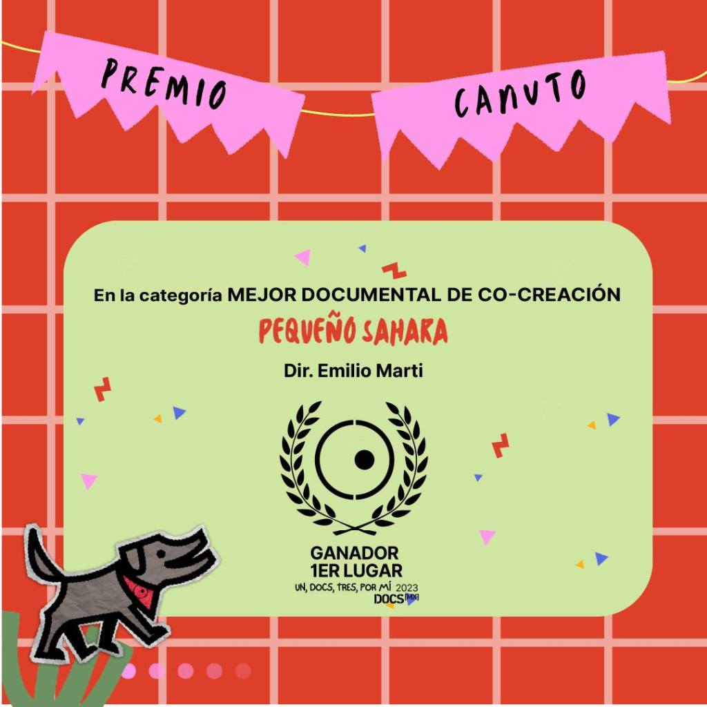 Nos comunican desde el DocsMX que nuestro PEQUEÑO SÁHARA ha ganado el premio a la cocreación dentro de su espacio Un, DOCS, tres por mí: se reconoce así cómo hemos conjugado dentro de una producción audiovisual nuestro trabajo profesional con las aportaciones de quienes participaron en los talleres de animación organizados por FiSaharaNomads HRC y Tiba Sidihaiba: