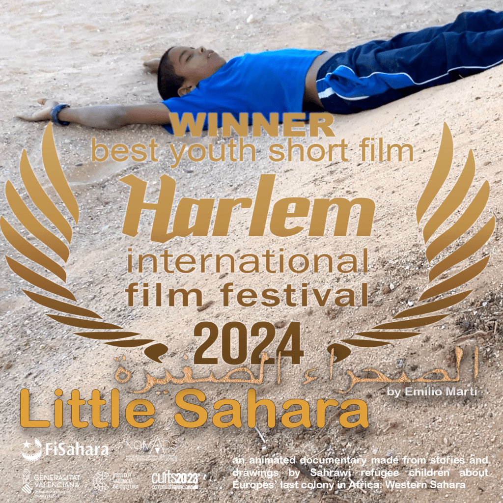 la juventud saharaui apenas ha salido de los campos de refugio en los que Argelia les permite vivir, en lo más duro del desierto (la hamada). España tiene pendiente desde los 60 la descolonización de Sáhara Occidental: es la última colonia europea oficial que queda en África y que esté ocupada no es óbice para que desde la Moncloa se asuman responsabilidades y se gestione el traspaso del territorio a les saharauis. Pedro Sánchez Pérez-Castejón debe atender a la petición de United Nations y decolonizar el Sáhara; reconocer el territorio que le otorgó la Asamblea General hace 50 años y denunciar el incumplimiento de los Derechos Humanos por parte de Marruecos, potencia ocupante del Sáhara Occidental (España es la potencia administrativa). Gracias a Harlem International Film Festival por el premio y a quienes nos ayudaron a realizar el documental, sobre todo a los jóvenes saharauis que ponen imágenes y testimonio a la peli; a Nomads HRC, FiSahara y Tiba Sidihaiba por presentárnoslos y facilitar los talleres que iniciaron #LITTLESÁHARA; a Arturo Arias por el sonido de la peli; y a la Filmoteca valenciana – IVC GVA (con Irene Kubs Cubells) por la distri del corto durante 2023.
